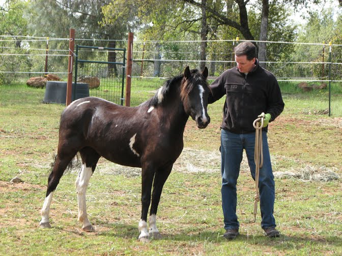 Rogie took the pressure off the situation by leaving the paddock to nibble grass on the outside, and then he controlled exactly how much contact he had with Twister by sniffing noses with her under the electric tape. You could see the gears in her head turning as she was trying to suss out whether or not she could fit under the tape like Rogie does, but she wisely realized she couldn't. Interesting to see her intelligence at work like that. You can see Obie do that at times -- actually think through a problem and figure out the best way to deal with it.